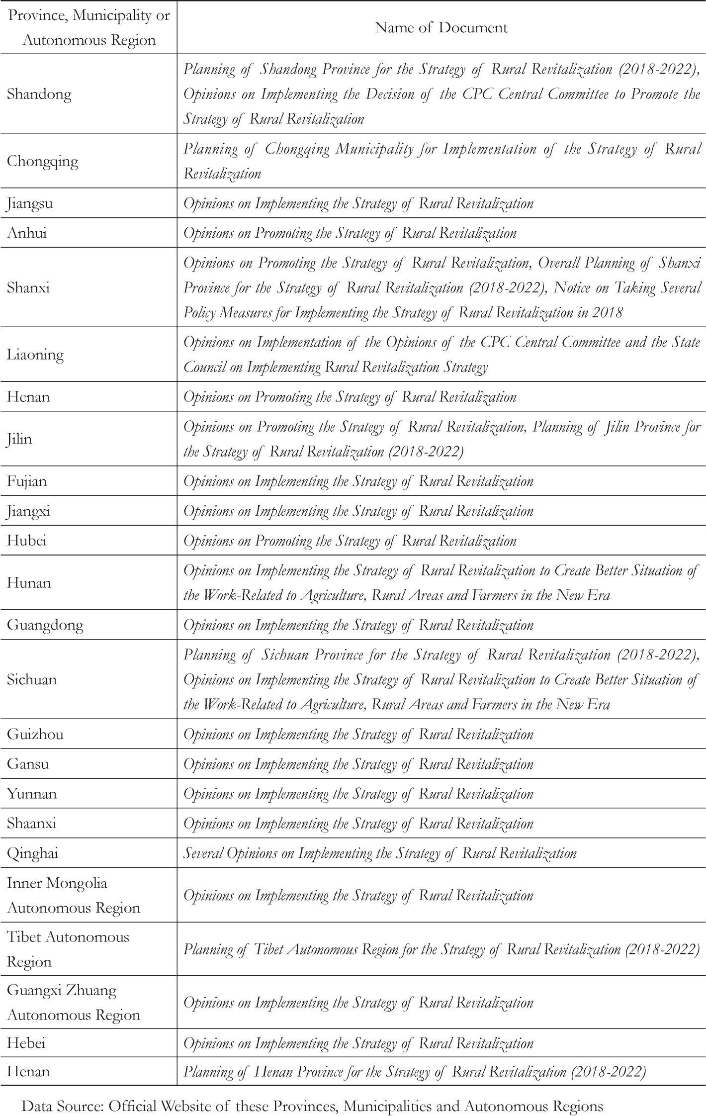 By the end of 2018, the population of permanent rural residents in China was 564.01 million, dropped by 12.6 million and 2.23% as compared to that in 2017.2706314 Farmers are the largest social group in China, and the protection of their rights should not be ignored. The strategy of rural revitalization was proposed in the report to the 19th CPC National Congress to provide a comprehensive solution for the problems related to agriculture, rural areas and farmers with overall planning. In this context, rural does not simply mean rural areas but covers agriculture, rural areas and farmers. In 2018, the CPC Central Committee and the State Council has issued Opinions on Implementing Rural Revitalization Strategy and Planning for the Strategy of Rural Revitalization (2018-2022) to promote the integration of urban and rural development from top-level design, aiming at solving the problem of the separate urban-rural structures, completing the restructuring and optimization of the rights and interests of farmers, and realizing urban-rural equalized development. In the Planning for the Strategy of Rural Revitalization (2018-2022), the term “farmer” appeared for 110 times. By December 2018, 24 provinces, municipalities and autonomous regions in China have published relevant documents focusing on the implementation of the strategy of rural revitalization to make overall design and periodic planning for a series of works such as promoting comprehensive rural revitalization, enhancing constructive interactions between urban and rural areas, and protecting the rights and interests of farmers. (See Table 1)