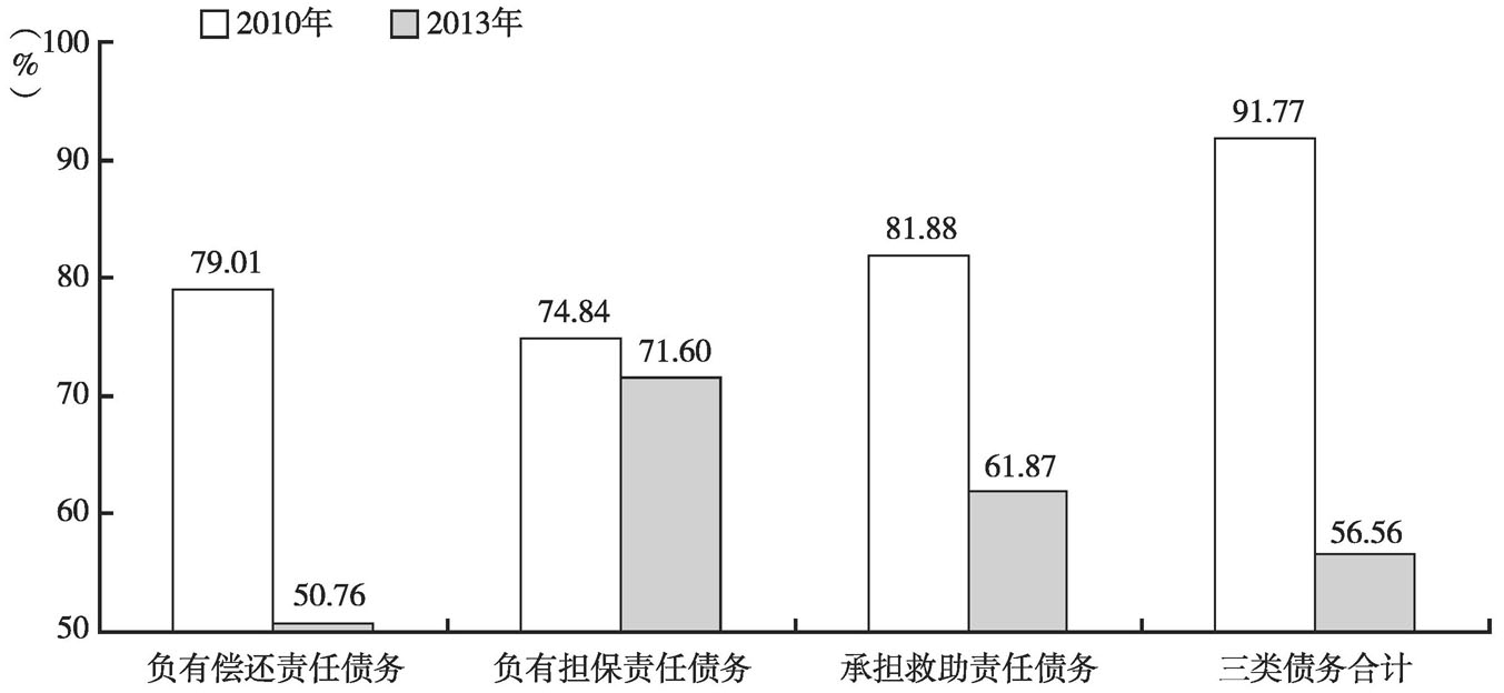 实际上,早在2010年6月,国务院就出台了《关于加强地方政府融资平台公司管理有关问题的通知》,要求地方政府对融资平台1372410进行清理规范。受此影响,地方政府性债务1372411的资金来源和借债主体都发生了显著的变化。一方面,由于地方政府在银行获得正规信贷的管道被收紧,地方政府性债务不得不“去银行化”。从资金来源上看,如图1所示,银行贷款占地方政府负有偿还责任债务的比重从2010年的79.01%下降至2013年的50.76%,占三类债务合计余额1372412的比重从2010年的91.77%下降至2013年的56.56%。另一方面,由于作为地方债举债主体的融资平台公司受到严格监管,地方政府性债务不得不“去平台化”。从举债主体看,融资平台公司占地方政府负有偿还责任债务的比重从2010年的46.75%下降至2013年的37.44%,占三类债务合计余额的比重从2010年的46.38%下降至2013年的38.96%。不难看出,地方政府性债务的资金来源和举债主体均发生了较大的变化。这其中,负有直接偿还责任的地方政府债务变化最大。然而,正所谓上有政策、下有对策,地方政府行为的变化具有表面性。严格地说,无论是“去银行化”还是“去平台化”,都还主要停留在表面文章上。