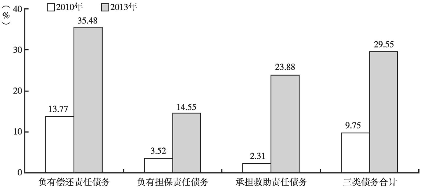 地方政府的“另一手”是抓举债主体,即通过属下的地方国有企业“曲线救国”。具体而言,在举债时,地方政府授意属下的国有企业向商业银行申请贷款并提供资产负债表,而融资平台公司则提供相应的质押或抵押物,国有企业获得贷款后,通过相关公司之间走账的形式,将资金打给融资平台公司;在还债时,融资平台公司再按照资金进账时的相关路数,将资金辗转打回给贷款企业。当然,除此之外,地方政府还有更加“野路子”的做法:那些获得银行贷款的国有企业不通过划账等形式将资金辗转打给融资平台公司,而是单独开设一个账户,交由融资平台公司直接使用。最终体现在举债主体上的就是,国有企业如今已然成为仅次于融资平台公司、政府机构的大户:2013年,国有独资或控股企业举债余额占地方政府负有偿还责任债务的比重达到10.62%,占三类债务合计余额的比重达到17.53%(见图3)。与此同时,融资平台公司所占份额在2013年分别比2010年下降8.94个百分点和17.53个百分点。不难发现,地方政府从融资平台转向国有企业,初看起来似乎更加市场化,但背后的实质没有改变。从根本上说,地方政府依然通过平台进行筹资,仅仅实现了表面上的“去平台化”。
