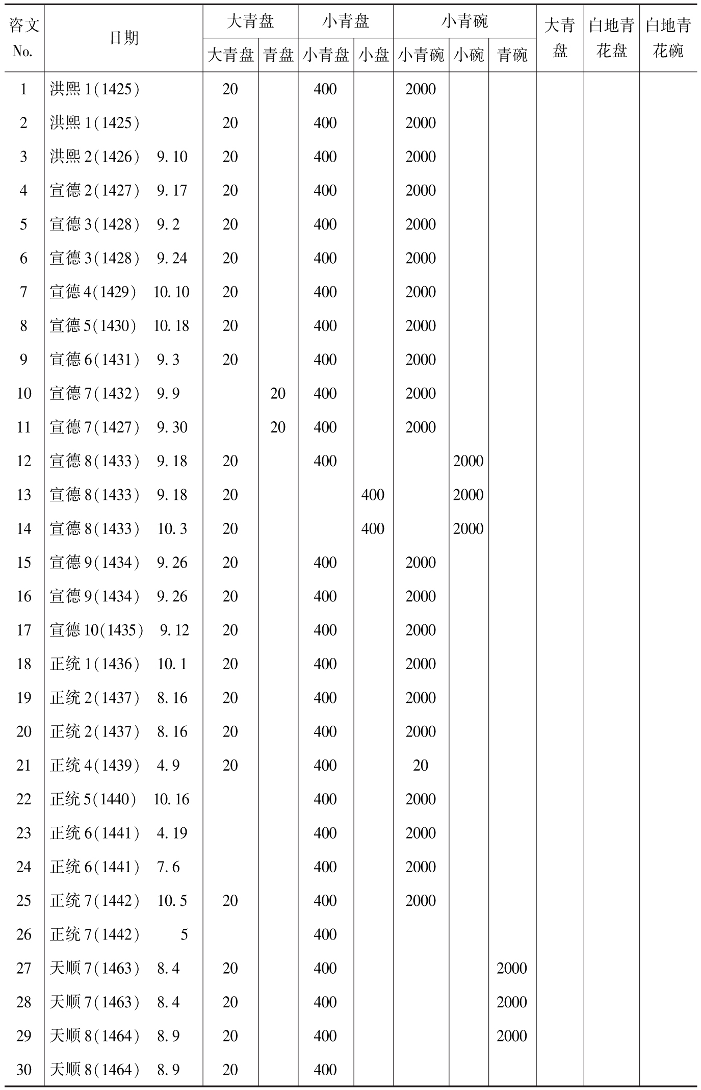 明代前期的朝贡贸易体系中,作为中国与东南亚多边贸易关系中介的琉球王国,对中国陶瓷器的输出起到了重要的转口作用。“其国不贵纨绮,惟贵瓷器、铁釜”1727842,所以,明朝对其赏赐多用陶瓷器。《明实录》中有不少关于琉球以中国陶瓷器为重要物资到东南亚各国贩运“贡品”的记载,如正统六年(1441年),琉球国通事就驾船载中国陶瓷器等物往爪哇购买胡椒、苏木等物。1727843同时,以处州青瓷器(龙泉青瓷器)为代表的中国瓷器也是琉球王朝转送朝鲜、日本以及暹罗等国的重要礼物。据琉球《历代宝案》记载,1419~1470年琉球王国发往东南亚的21艘船只中把青瓷器作为礼品送出的情况为:暹罗28次、巨港7次、爪哇5次、马六甲9次、苏门答腊2次,朝鲜1次。整个15世纪,琉球至少将95000件青瓷器作为礼物送给东南亚国家。1727844这些礼物的一般标准包括2420件陶瓷器:20件青瓷大盘、400件青瓷小盘、2000件青瓷小碗(见表4-1)。特别是对暹罗的贸易,据学者统计,从洪熙至宣德年间(1425~1435年),前往暹罗国的琉球船只多达17艘次,琉球国每次派遣人船均备有绸缎、大小青瓷器物以及硫黄、扇、腰刀等丰厚的礼物奉献给暹罗国王。以“照得本国稀少贡物,为此今遣正使……,坐驾盘字号海船……,装载磁器等物,前往贵国(暹罗)出产地面收买胡椒、苏木等物回国,谨备进贡大明御前”的名义,希望暹罗国王能够给予琉球国人船,“容令买卖,及早打发,乘趁迅风回国便益”。1727845琉球与暹罗的通使互市在永乐、宣德以至正统年间,曾经兴盛一时。