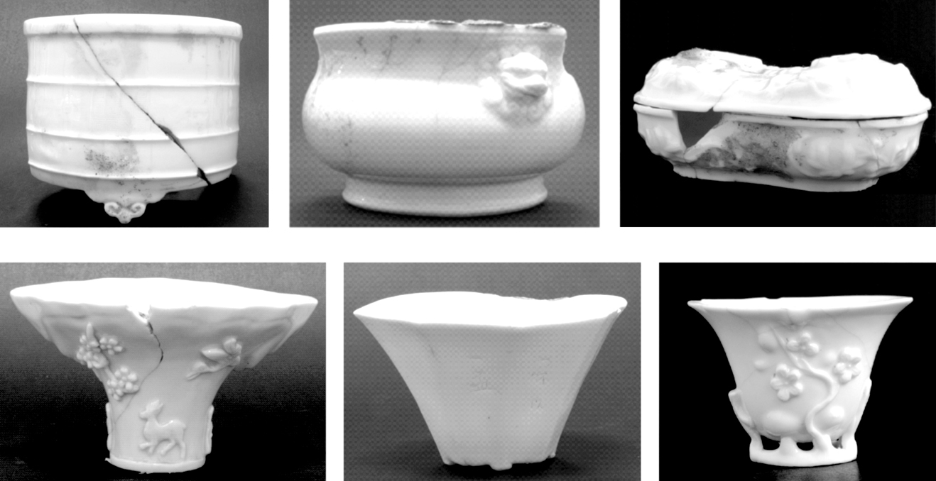 德化地区是明清时期华南窑业的另一个中心。明清德化地区制瓷业在宋元青白瓷烧造的基础上提高了制瓷技术,进一步发展了元以来分室龙窑的优势,创造了所谓“中国白”的世界名品。依照其瓷质和釉色,明代德化窑白瓷又被分为“乳白”“象牙白”“猪油白”“葱根白”“鹅绒白”等名贵瓷种。明代德化窑瓷器主要以适应市场需要的造型为主,除部分订制外销的产品外,大部分器型是民间百姓常用的日常器具,如碗、盘、盆、杯、碟、壶、炉、盒、洗、盏以及文人墨客和宗教方面的用品、陈设品等。德化窑的瓷塑艺术登峰造极,主要有观音、达摩、弥勒、如来、寿星、关公、童俑以及各种瓷塑人物造像。同时还造就了何朝宗、张寿山、林朝景等一批瓷塑艺术大师。经过发掘的这一时期的瓷窑有甲杯山窑和祖龙宫窑。2001年,福建文物部门对德化甲杯山窑址进行了发掘,揭露出元代至明代的3座窑炉遗迹,出土了白釉器物,包括观音、弥勒、童子等人物塑像,以及杯、洗、瓶、执壶、水注、盒、匙、炉、鼎、钵、盏、碗、盅、洗等。这批瓷器(见图9-6)釉色精美,以“猪油白”白釉产品为主,其明代窑炉为分室龙窑。17281432004年,福建文物部门又发掘了德化的祖龙宫窑址,发掘出有上下叠压打破关系的元至明代的3座窑炉,出土有元代青白瓷、白瓷以及明代的象牙白瓷和平底匣钵等物。1728144这两处为明清德化地区烧制白釉瓷器的代表性窑址。